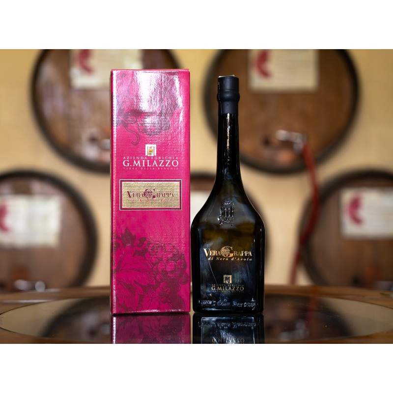 Dalle migliori vinacce di Nero d'Avola selezionate nei vigneti di casa Milazzo, nasce questa decisa Grappa distillata con alambicco discontinuo a vapore.