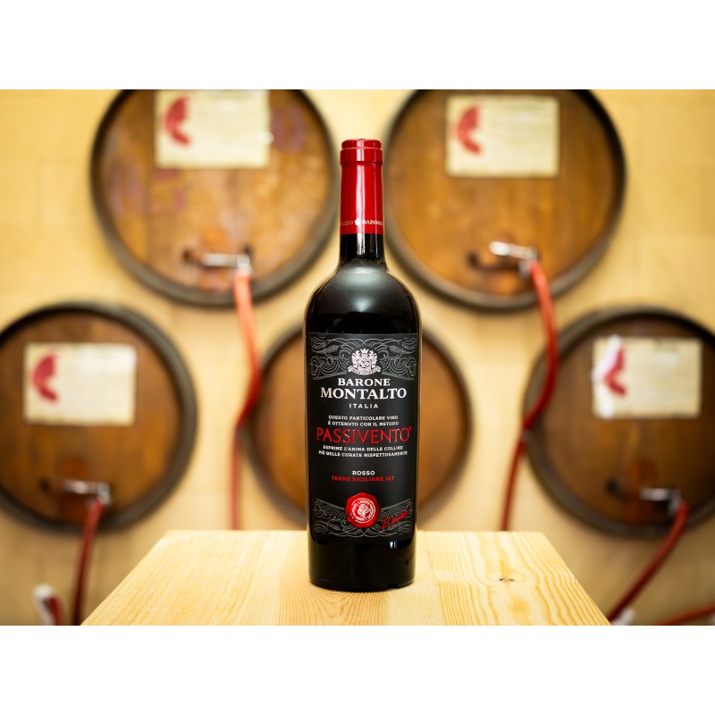 ll Passivento Rosso di Barone Montalto è un Nero d'Avola monovitigno che si presenta nel bicchiere con un colore rosso porpora intenso. Questo vino rosso italiano accarezza il naso con tutti i tipi di frutti di bosco maturi, freschi e secchi, prugne e qualche ciliegia Mon Chéri. Aromi speziati di caramello un po' burroso, fichi canditi e delicato rovere nobile completano perfettamente il bouquet. Al palato, il Passivento Nero d'Avola di Sicilia delizia con il suo gusto rotondo e corposo. La fine dolcezza è contrastata da una freschezza fruttata e da tannini morbidi.
